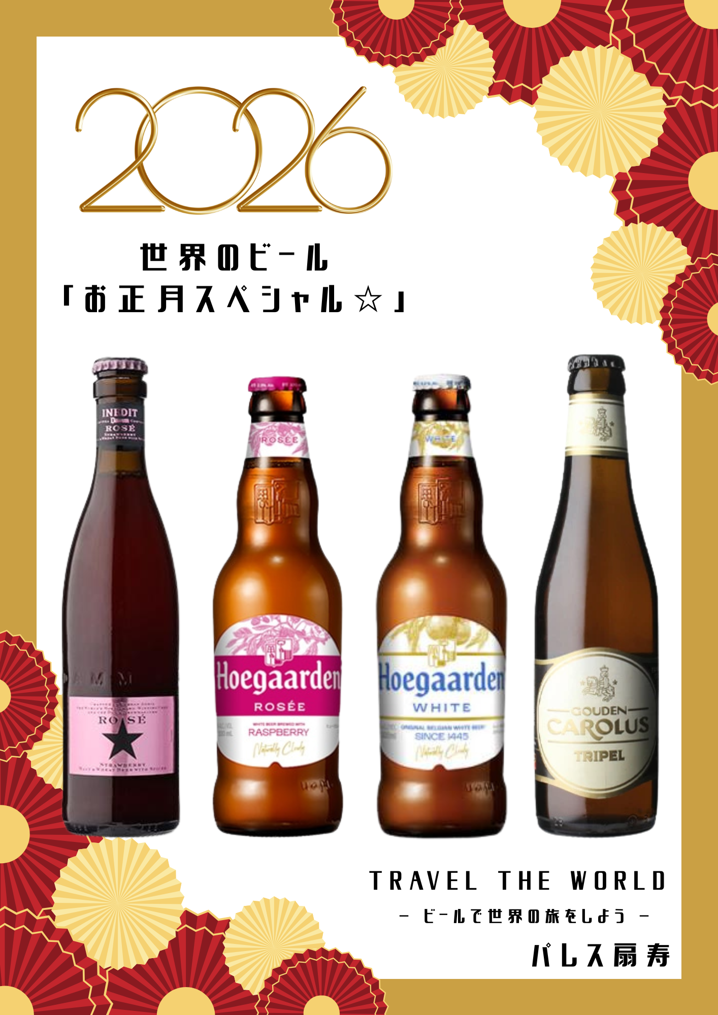 ~ビールで世界を旅しよう~ TRAVEL THE WORLD 今回は『お正月スペシャル2026』 パレス扇寿では、海外ビールをご用意しおります。 シーズンごとにビールが変わり、毎回違った銘柄が楽しめるのが魅力的! 今月のビールはこちら INEDIT ROSE Hoegaarden ROSEE Hoegaarden WHITE GOUDEN CAROLUS